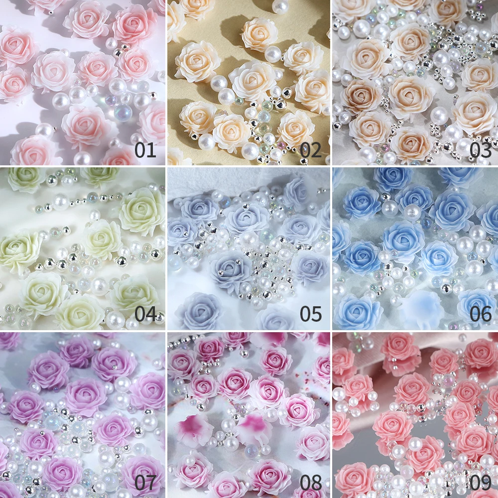 Different sizes of roses, they have shiny edges on them( not all of them tho,they might missed some). also tiny round balls gold white and aee through. looks adorable.