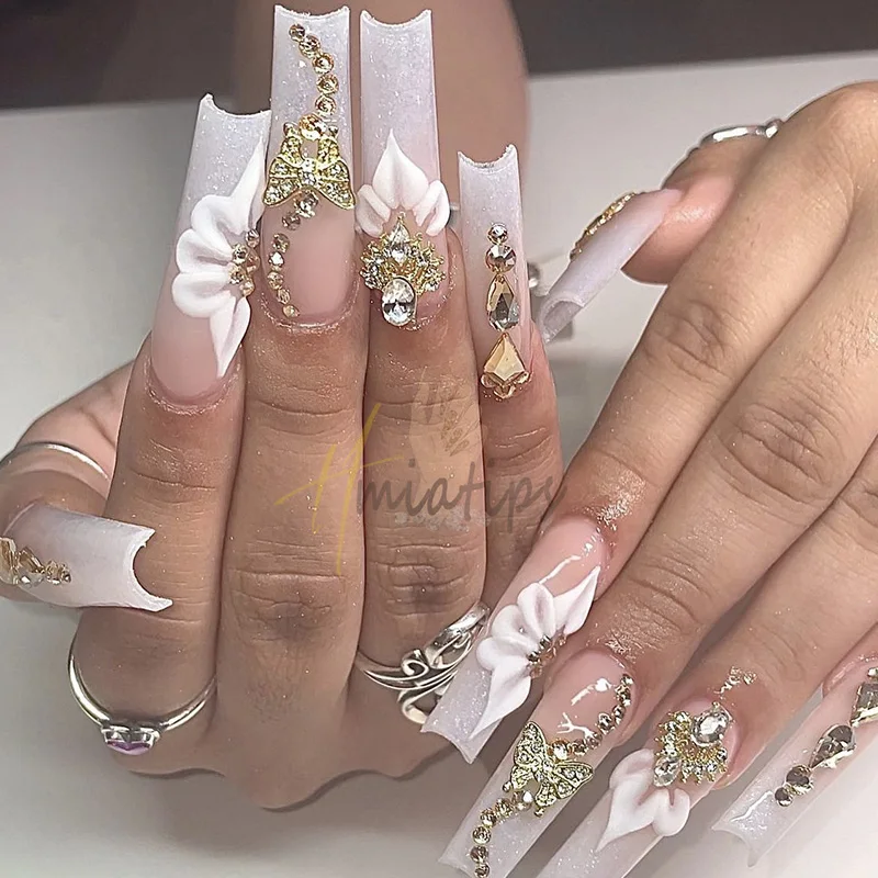 these are perfect for a quick acrylic design without using actual acrylic I love them theybare small in size not suitable for a XXL or xxxl nail unless you use several on one nail itself. only 5 pieces too. but totally affordable and so worth purchasing. these also shipped in a timely manner I was surprised to get a week later if not sooner than that.