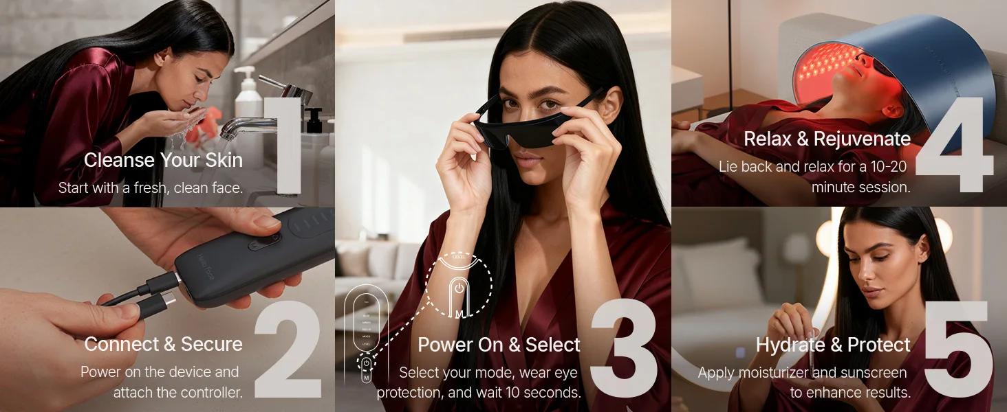 For maximum safety, our red light face mask incorporates an 8-stage temperature control protection system and a unique honeycomb structure that prevents direct contact between skin and LED bulbs, completely eliminating any risk of burns. Protective goggles must be worn during facial red light treatments. The system features a 10-second safety buffer after the last button press – if no operation is detected, it will beep 3 times before activation.