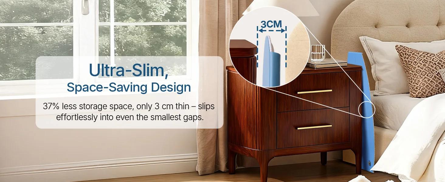 37% less storage space, only 3 cm thin- slips effortlessly into even the smallest gaps