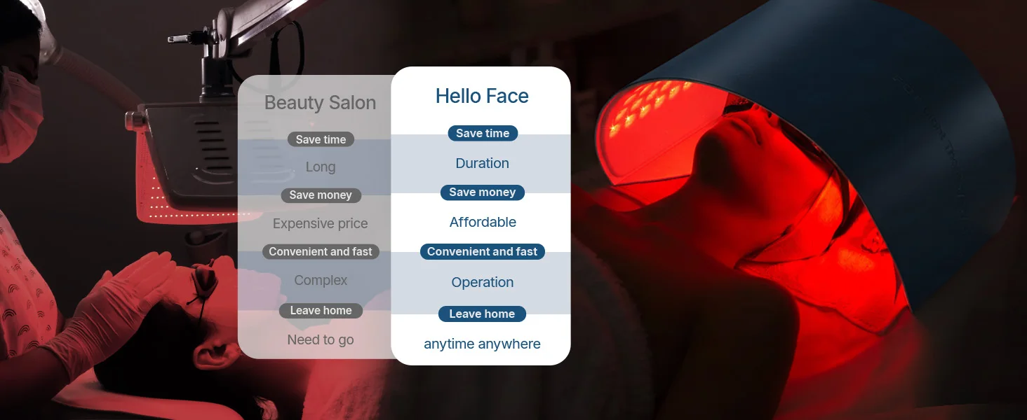 Say goodbye to bulky, hard-to-assemble spa machines. The Hello Face red light therapy mask sets up in just 5 seconds, delivering professional-grade care at home, nourishing and protecting your skin to maintain its vitality. Designed for ultimate efficiency, it covers 98% of facial contours yet takes up less than 1/10 the space of traditional salon devices—offering visible skin improvements without the hassle. Save time and money!