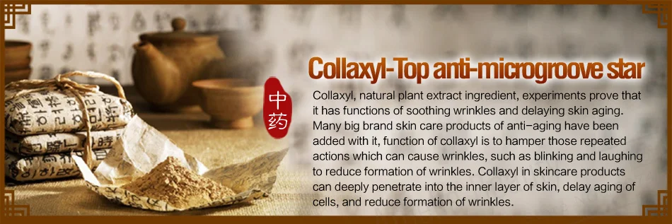 Collaxyl, natural plant extract ingredient, experiments prove that it has functions of soothing wrinkles and delaying skin aging. Many big brand skin care products of anti-aging have been added with it, function of collaxyl is to hamper those repeated actions which can cause wrinkles, such as blinking and laughing to reduce formation of wrinkles. Collaxyl in skincare products can deeply penetrate into the inner layer of skin, delay aging of cells, and reduce formation of wrinkles.