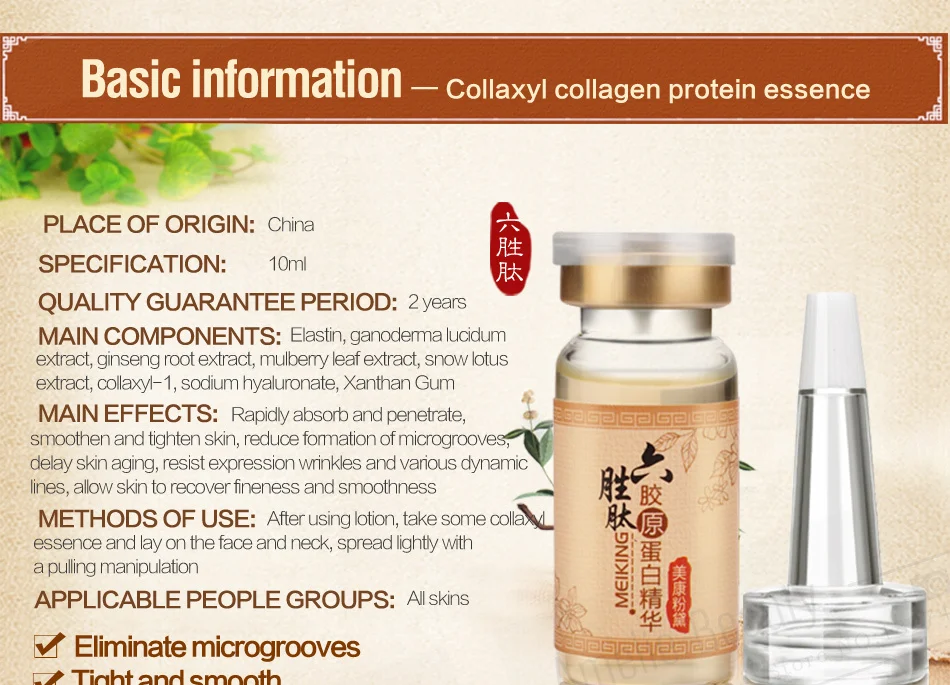 Rapidly absorb and penetrate, smoothen and tighten skin, reduce formation of microgrooves, delay skin aging, resist expression wrinkles and various dynamic lines, allow skin to recover fineness and smoothness.