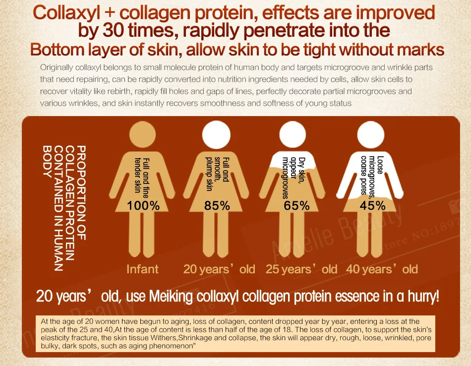 Originally collaxyl belongs to small molecule protein of human body and targets microgroove and wrinkle parts that need repairing, can be rapidly converted into nutrition ingredients needed by cells, allow skin cells to recover vitality like rebirth, rapidly fill holes and gaps of lines, perfectly decorate partial microgrooves and various wrinkles, and skin instantly recovers smoothness and softness of young status.