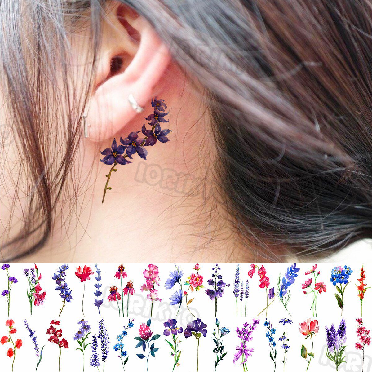 Watercolor Lavender Flowers Temporary Behind Ear Tattoo For Woman Women Girls Realistic Sweet Pea Thorns Fake Tattoo Sticker Neck Tattoos